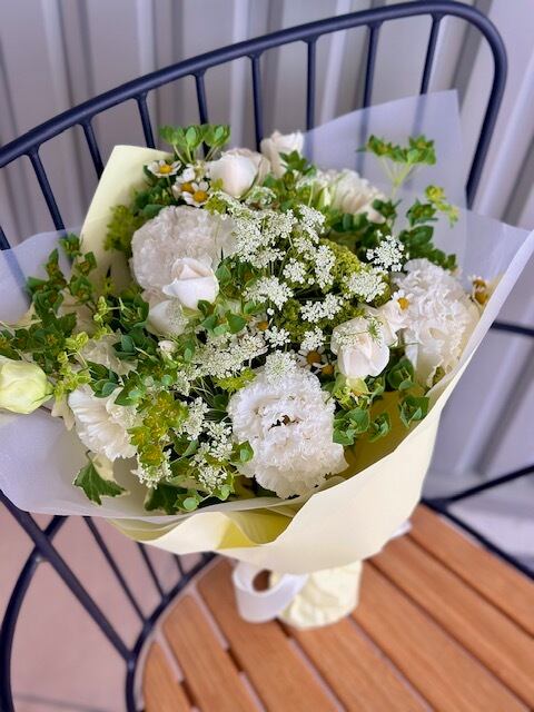 ホワイトとグリーンでまとめた。清楚で上品な印象のブーケです。たっぷりのグリーンがナチュラル感を演出し、安らぎと落ち着きを与えてくれます。飾る場所を選ばず、どんなシーンにも寄り添う、心温まるギフトです。