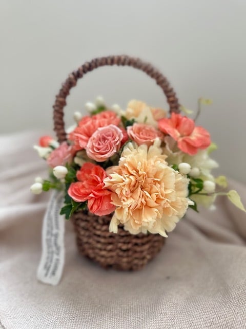 ナチュラルなバスケットに、オレンジやピンクのカーネーションと小花をあしらいました。カーネーションの「純粋な愛」「感謝」の花言葉が、日頃の感謝や優しい気持ちを伝えます。コンパクトなサイズなので、場所を選ばず飾っていただけます。