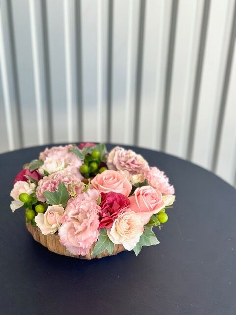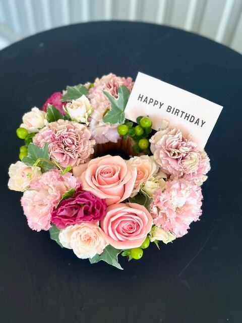 リング型が可愛らしい、ピンクのグラデーションのアレンジメントです。途切れることのない「永遠」を意味するリングは、結婚記念日や長寿のお祝い、変わらぬ感謝を伝えたい方に最適です。テーブルを華やかに彩り、見る人の心を癒します。