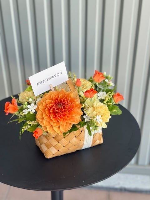 目を引くダリアを中心に、オレンジとイエローの暖色系でまとめた、太陽のようなバスケットアレンジメントです。見ているだけでも元気をもらえます。明るく華やかな雰囲気は、開店祝いや発表会、誕生日など、特別なお祝いに最適です。