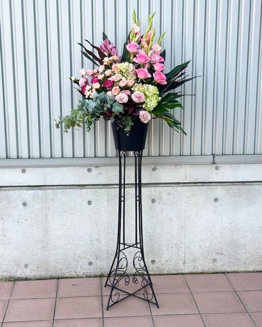 目に飛び込む華やかなピンクのスタンド花です。「おめでとう!」の気持ちを華やかに届けてくれます。お店のオープンや、みんなが集まるパーティーなど、楽しいお祝いのシーンにぴったりです。贈られた方もきっと笑顔になるはずです。