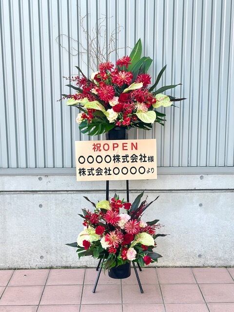 「情熱」を感じさせる赤を基調としたスタンド花です。躍動感あふれる枝物と、洗練された花々が共演し、見る人の目を釘付けにします。開店祝いや周年記念、特別なイベントなど、力強いお祝いの気持ちを伝えたい時におすすめです。