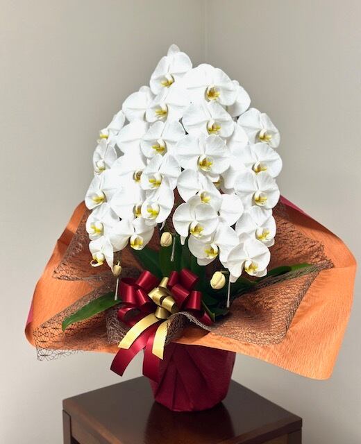 豪華に花を付けた、清楚で上品な純白の胡蝶蘭です。開業祝い、移転祝い、就任祝いなどのシーンにお勧めです。(20~25輪程度)