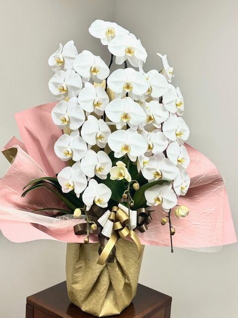 清楚な白が輝く、存在感抜群の胡蝶蘭は見る人を圧倒する豪華さです。上品なラッピングが、一層の特別感を出します。(25~30輪程度)