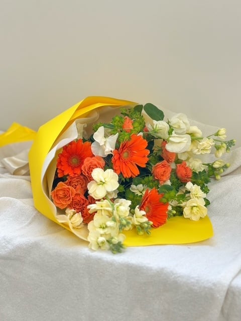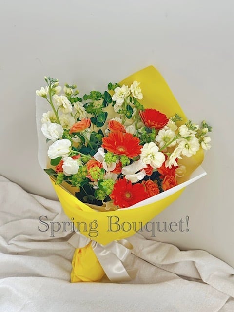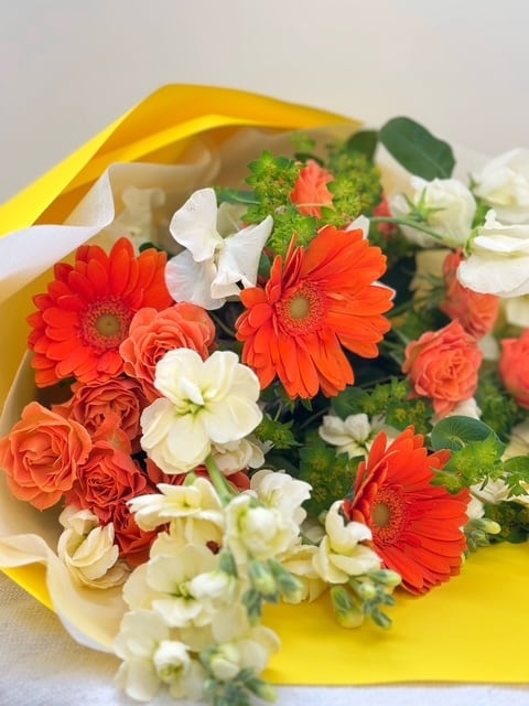 鮮やかなオレンジのガーベラと優しい香りのストックが織りなす、元気いっぱいの春色ブーケ。