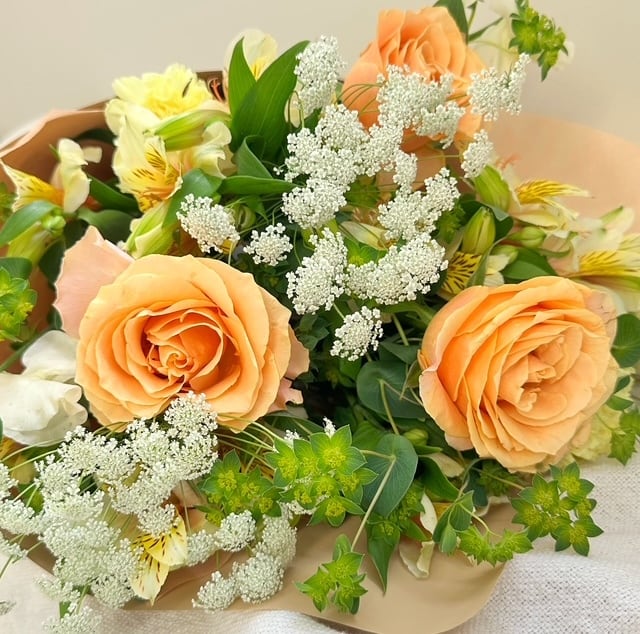 気品漂うバラと小花を散りばめた柔らかな光を纏うような花束です。