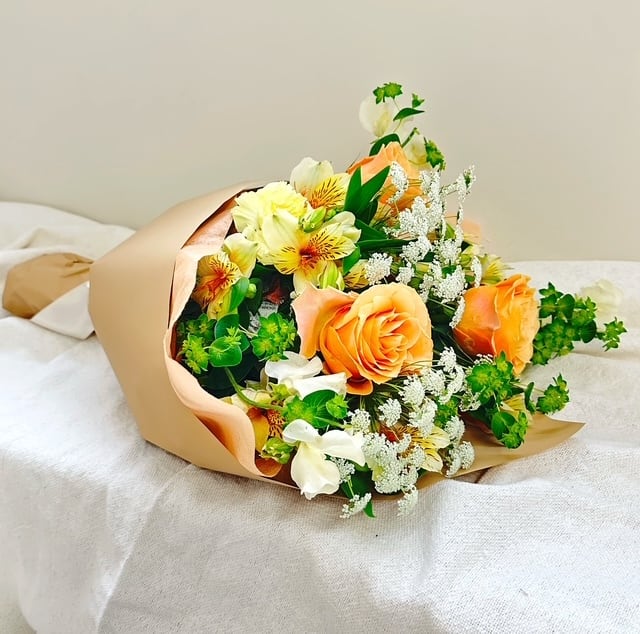 【卒業・送別お祝いブーケ】              オレンジ・グリーン系おまかせ花束