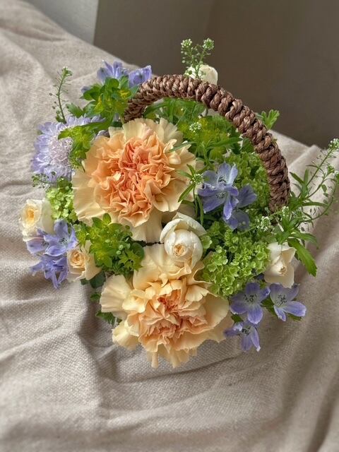 柔らかなアプリコットカラーと、心落ち着くパープルの小花を合わせた上品なアレンジメントです。