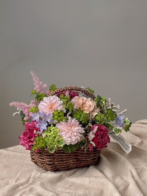 ダリアを添えてボリューム豊かに仕立てた、贅沢なアレンジメントです。